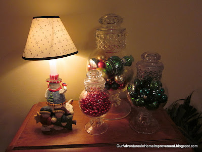 I added ornaments to a set of antique apothecary jars on my mantel.